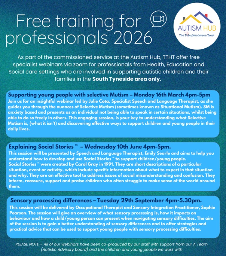 As part of the commissioned service at the Autism Hub, the specialist webinars below are free for professionals from Health, Education and Social care settings who are involved in supporting autistic children and their families in the South Tyneside area only.