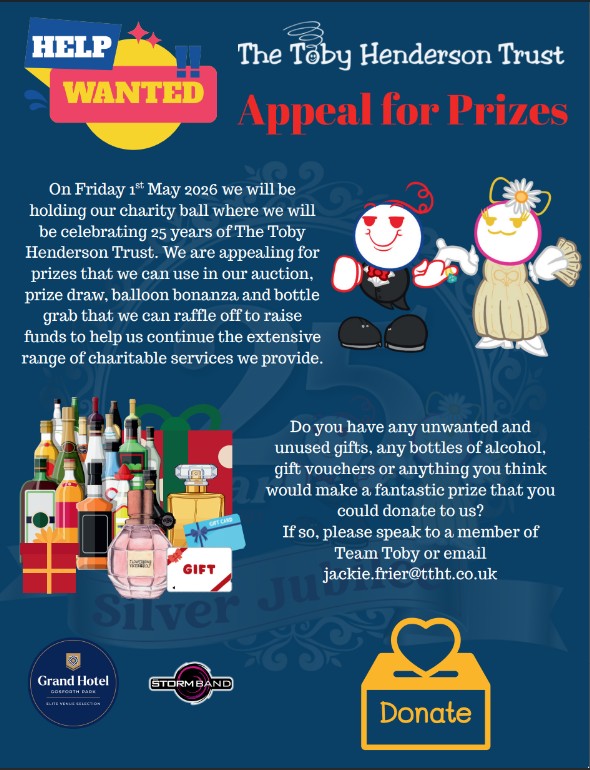 As we are celebrating 25 years of The Toby Henderson Trust, we are giving away two tickets to our Silver Jubilee Ball taking place on Friday 1st May 2026 at The Grand Hotel, Gosforth Park.  There are also two cash prizes of £20 and £10 to be won.